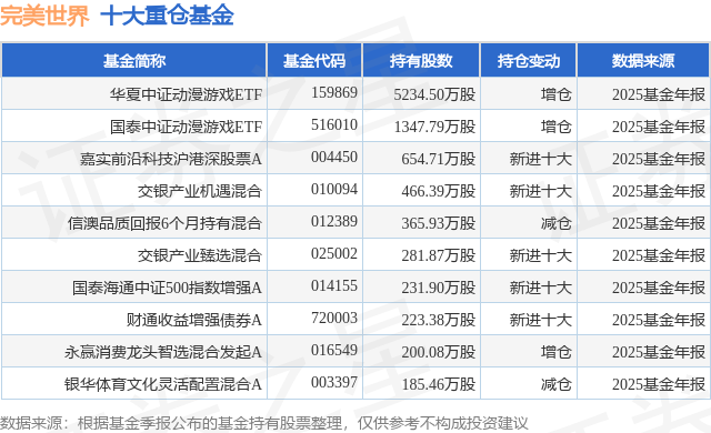 根据2025基金年报公募基金重仓股数据,重仓该股的公募基金共56家,其中持有数量最多的公募基金为华夏基金的华夏中证动漫游戏ETF。华夏中证动漫游戏ETF目前规模为126.11亿元,最新净值1.5398(2月6日),较上一交易日上涨0.56%,近一年上涨37.8%。该公募基金现任基金经理为鲁亚运。鲁亚运在任的基金产品包括:华夏创业板成长ETF联接A,管理时间为2022年6月10日至今,期间收益率为-1.22%;华夏中证全指证券公司ETF联接A,管理时间为2022年6月10日至今,期间收益率为27.7%;华夏国证疫苗与生物科技指数发起A,管理时间为2022年9月6日至今,期间收益率为-33.55%;华夏战略新兴成指ETF联接A,管理时间为2023年3月27日至今,期间收益率为30.38%。