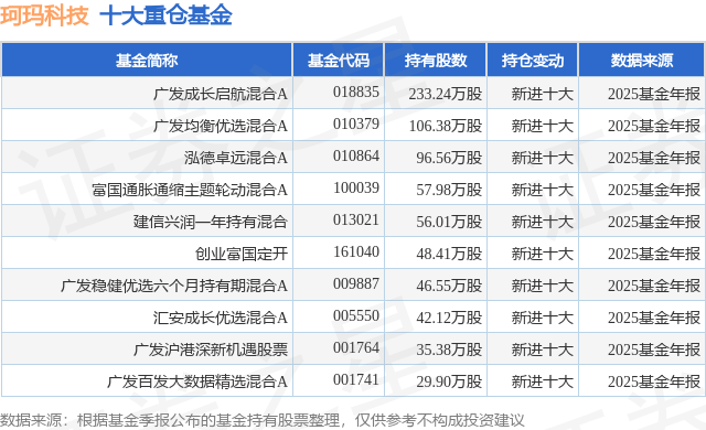 根据2025基金年报公募基金重仓股数据,重仓该股的公募基金共22家,其中持有数量最多的公募基金为广发基金的广发成长启航混合A。广发成长启航混合A目前规模为18.67亿元,最新净值2.7389(3月19日),较上一交易日下跌3.22%,近一年上涨59.14%。该公募基金现任基金经理为陈韫中。陈韫中在任的基金产品包括:广发中小盘精选混合A,管理时间为2021年9月28日至今,期间收益率为63.13%;广发科技动力股票,管理时间为2024年5月31日至今,期间收益率为77.29%;广发小盘成长混合(LOF)A,管理时间为2025年3月25日至今,期间收益率为45.42%。